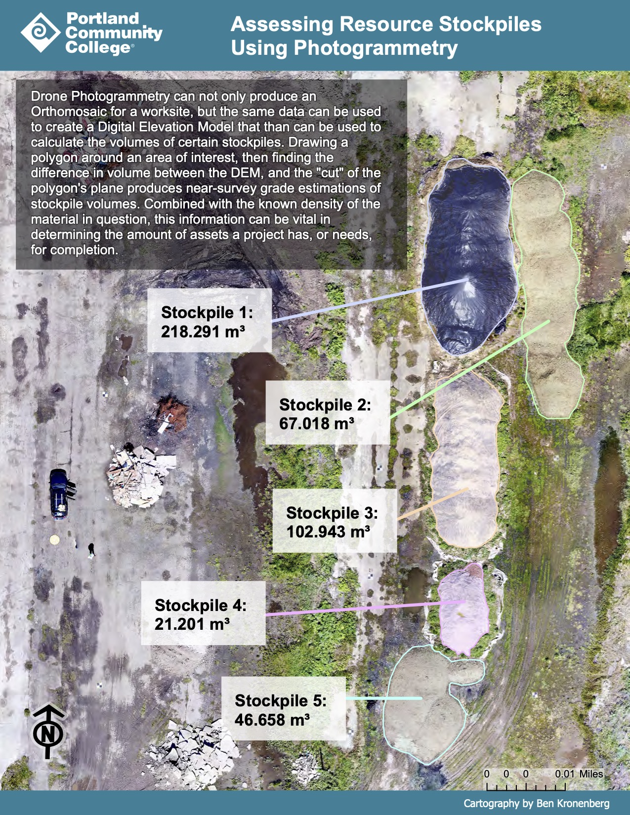 Drone imagery and Ground Control Points were collected and processed into a DEM and Orthomosaic with Agisoft Metashape Professional. The DEM data was used to assess the volume of five stockpiles, which has applications in construction, surveying, project management, and cost analysis.