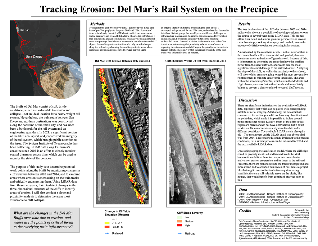 Using change computation on two sets of LiDAR data, I analyzed the progress and threat of coastal erosion to a major railroad line on the coast of San Diego, CA. The stretch of tracks that I conducted the analysis on has since undergone major reinforcement projects, but only after catastrophic landslides brought attention to the matter. Remote sensing techniques can be employed to regularly monitor the condition of cliffs in order to prevent catastrophic loss.