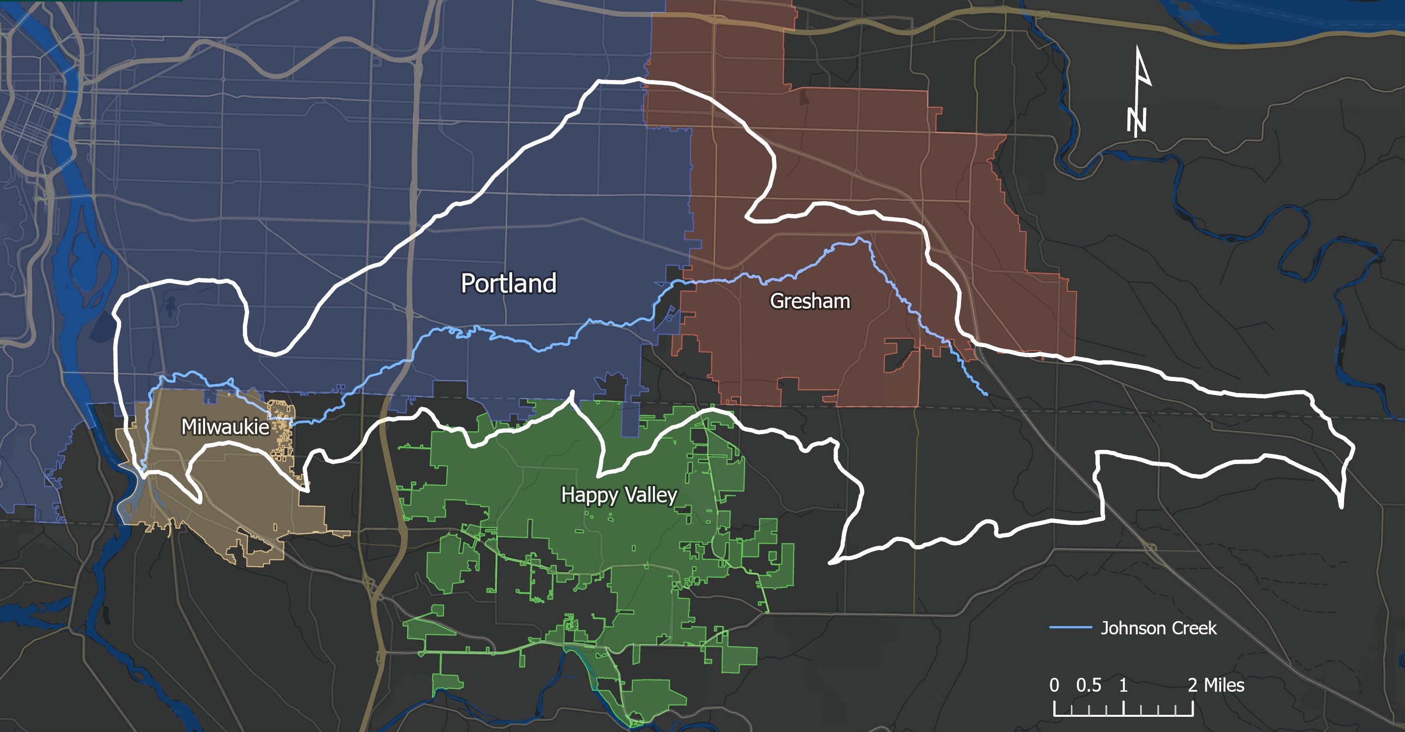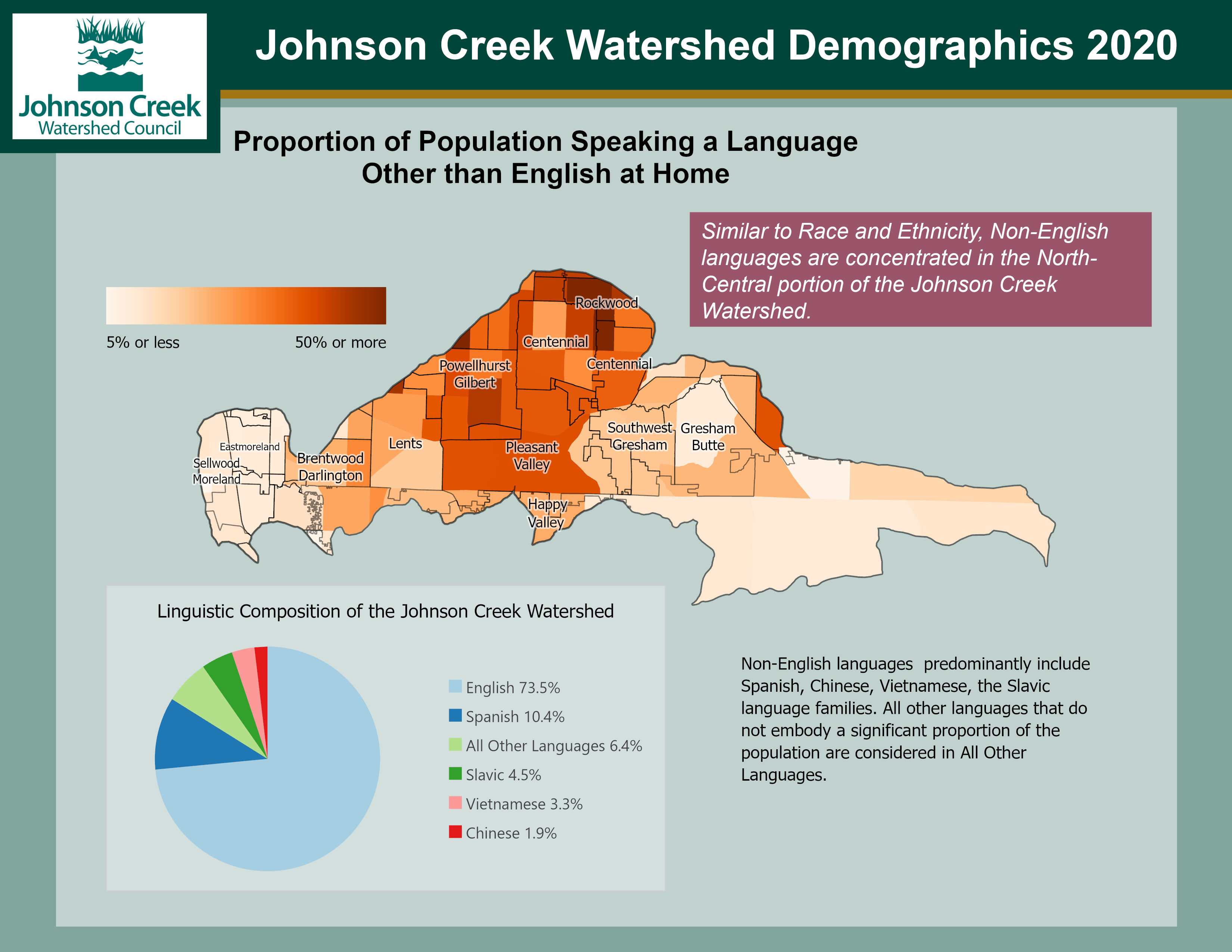 As a part of a larger study in partnership with the Johnson Creek Watershed Council, this map portrays the racial, ethnic and linguistic diversity of Johnson Creek Watershed within the jurisdiction of the city of Portland. I also developed a Storymap on this topic, which has also been published by the JCWC on their website. Other maps include a similar portrayal focusing on other jurisdictions, and the distribution of racial, ethnic, and linguistic diversity across the whole watershed by census tract.