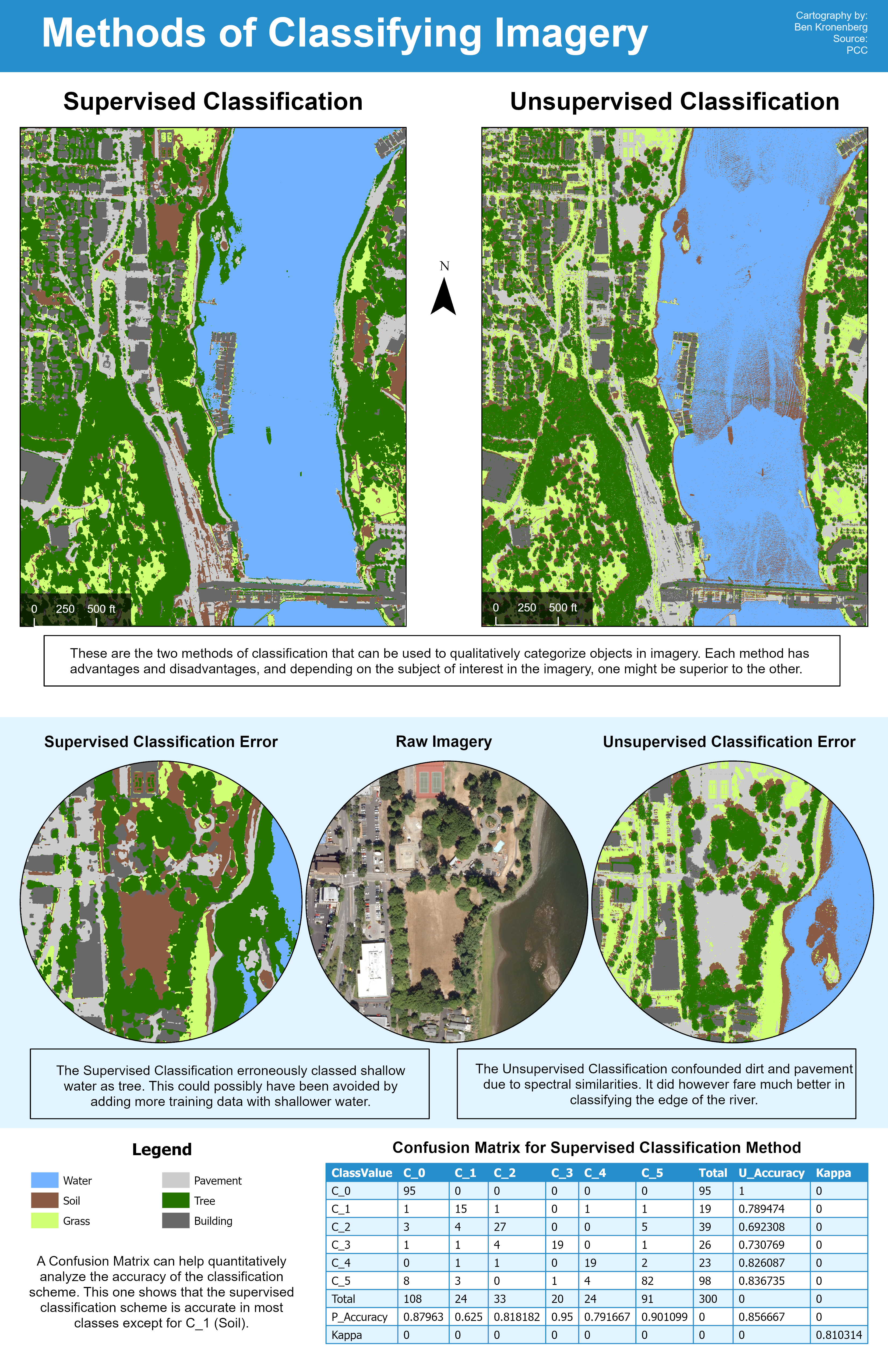 In order to draw significance from and run computations on satellite imagery, image classification can be employed to categorize the content with distinct values. This school lab exhibited two methods of classification: Supervised and Unsupervised. Depending on one’s needs, different methods may be preferred. A Confusion Matrix shows the accuracy of the classification scheme using known values.