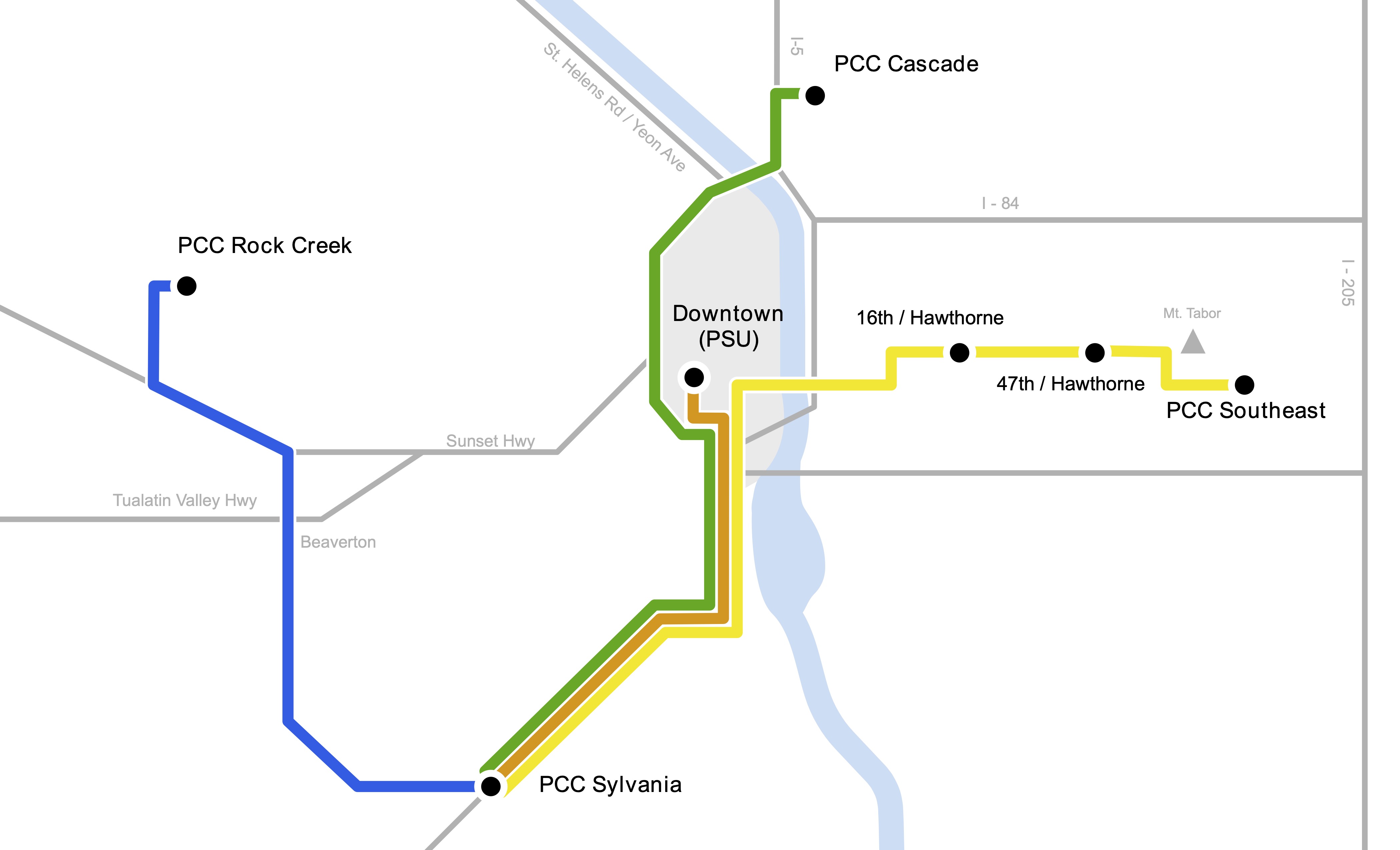 As part of an independent partnership with the Transportation department of Portland Community College, I developed a high quality, intuitive shuttle map for use in their printed media such as their brochures and posters. I currently am redesigning their brochure from scratch which will include this map on it. Focusing on simplicity, this map offers more spatial context to the shuttle system than the previous map, while keeping the information intuitive. Its vector-based design, small size, and CMYK color scheme makes it easily shareable and printable.
